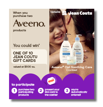 From October 16 to November 12, 2025 with any purchase of a participating Aveeno® product and upon presentation of a valid Moi card. Participants must have accepted all terms and conditions of the Moi program and completed their enrolment so that their entries in the contest are valid.